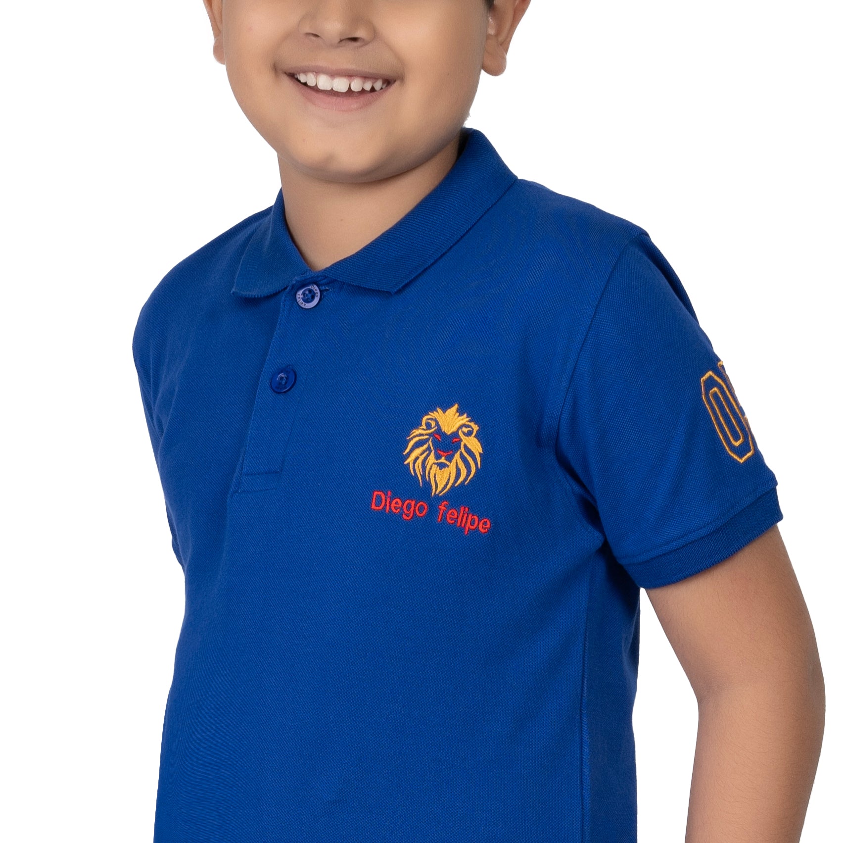 Diego Felipe boys blue polo t-shirt featuring a stylish lion print. Soft, comfortable fabric ideal for everyday wear and outdoor activities for ages 2–16.